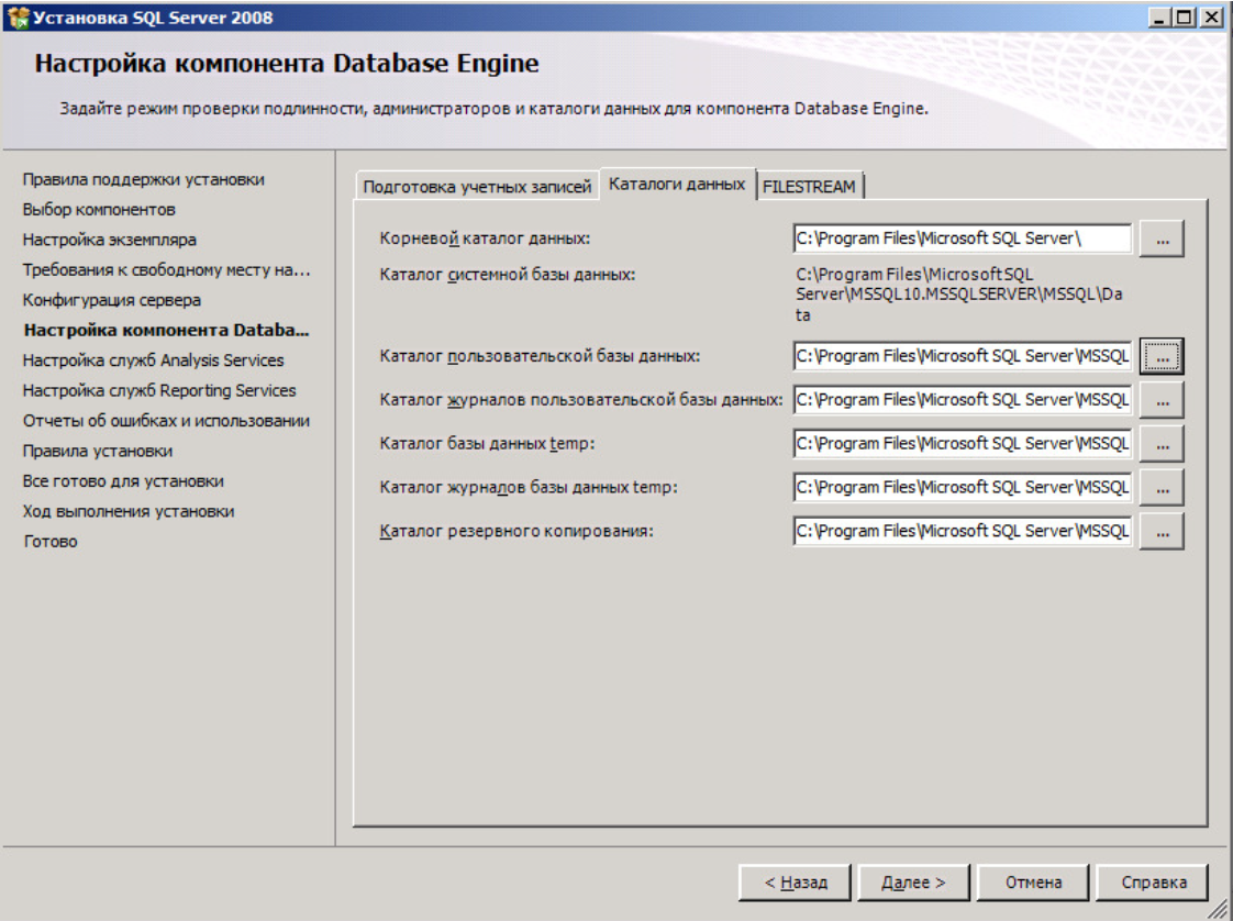 На вкладке «Каталоги данных» необходимо указать дефолтное размещение пользовательских баз данных, а также указать каталоги системных баз данных. Для повышения производительности SQL Server желательно разносить функционально разные базы данных. Так на отдельные физические диски необходимо разносить пользовательские данные, журнал пользовательских баз данных, базу данных temp и ее журнал. Также возможно указать дефолтный каталог для хранения резервных копий баз данных.
