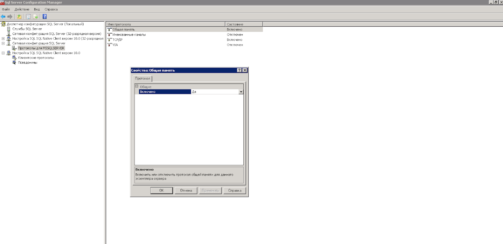 - Включаем Shared memory (показано на картинке). Актуально если службы 1С и MSSQL установлены на одном физическом или виртуальном сервере.
